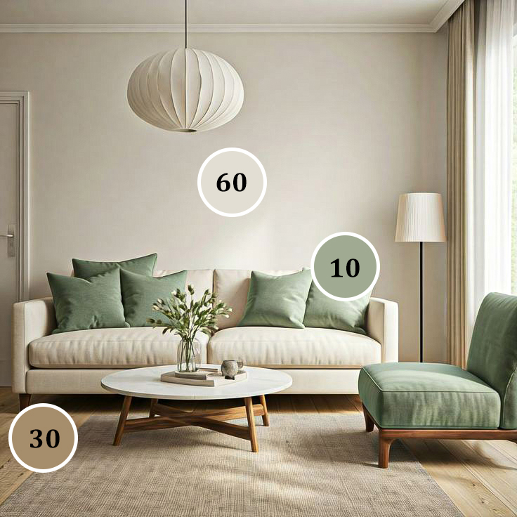 60-30-10 là một nguyên tắc vàng thường được áp dụng trong thiết kế, đặc biệt là thiết kế nội thất, giúp tạo ra sự cân bằng và hài hòa trong không gian. Nguyên tắc này chia tỷ lệ màu sắc và vật liệu sử dụng trong thiết kế thành ba phần chính: